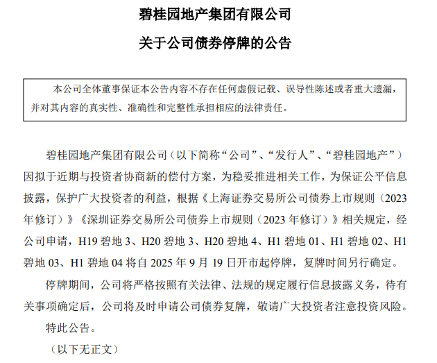 【大河财立方音问】9月18日,碧桂园地产集团有限公司发布公告称,因拟于近期与投资者协商新的偿付决议,为得当激动关系使命,保证信披公温煦保护投资者利益,经央求,H19碧地3、H20碧地3、H20碧地4、H1碧地01、H1碧地02、H1碧地03、H1碧地04等7只公司债券将自2025年9月19日开市起停牌,复牌时刻另行详情。
