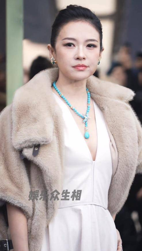 章子怡今日身穿一条白色深V长裙,大露行状线,气质厚重又大气,外面还披了一件米色毛毛外衣,贵气完全,短暂碾压全场。