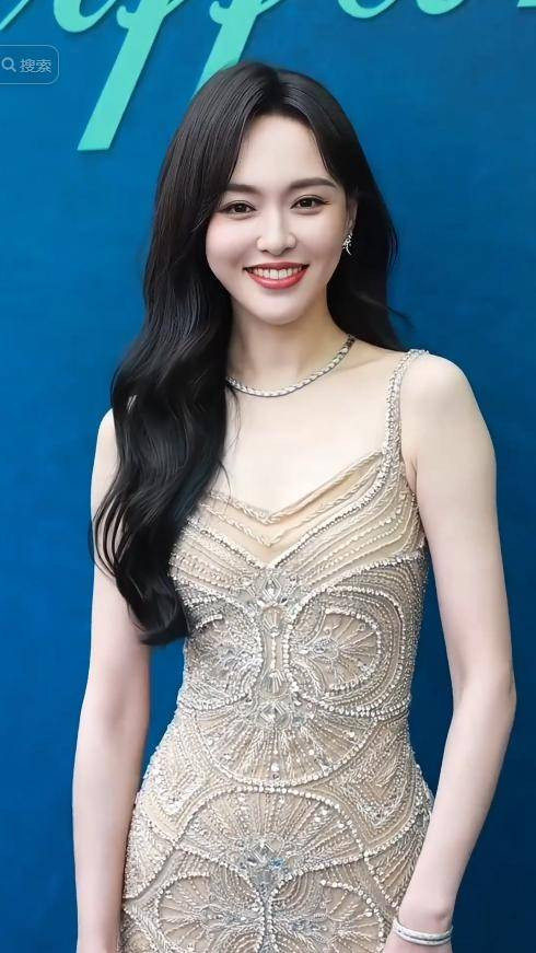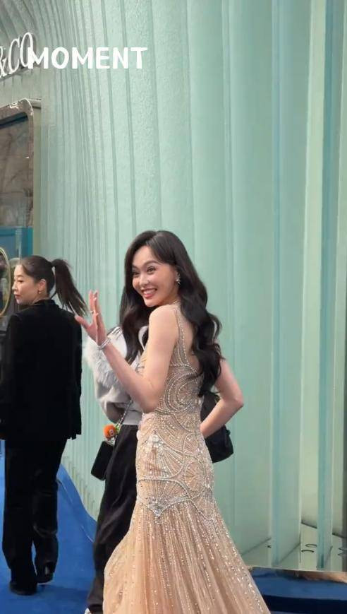 裙子的金属质感很强,在灯光下闪着细碎的光辉,修身的剪裁精确勾画出她的优雅弧线,统共这个词东说念主温婉又有气场。