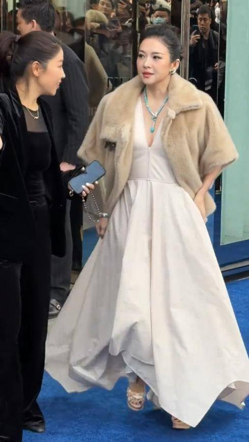 她佩带着品牌象征性的蓝色珠宝,颈间的项链和耳环相互呼应,考究又丽都,哪怕两颊有些发腮,也涓滴莫得影响她的气场。