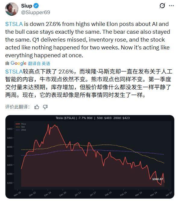 但悲不雅心境相似在推广。有网友指出,特斯拉股价距高点已回撤近28%,但搞定层在应酬平台上的发声要点却时常偏向AI业务。商场多空两边的底层逻辑其实并未改变:托福不达标与库存高企是既定事实,股价此前对利空保捏钝化,如今更像是扫数隐患在财报节点采集已毕。