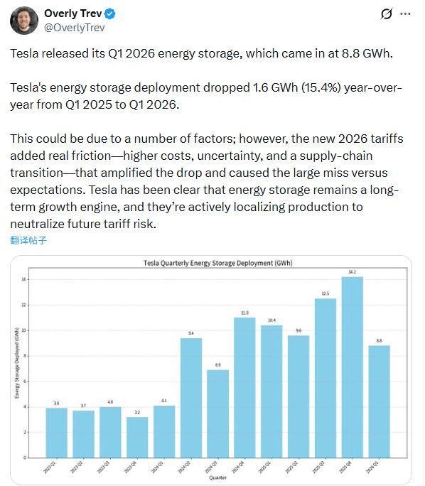 特斯拉的储能业务在往日几个季度一直是提振财报的亮点,但本季度情况出现了逆转。公司证明称,第一季度部署了8.8吉瓦时的电板储能居品,同比下降15.4%,更是远低于2025年第四季度创记录的14.2吉瓦时。