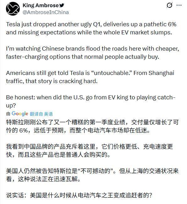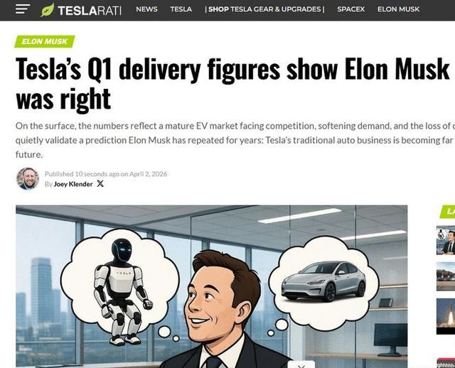 科技媒体Teslarati则在一篇名为《特斯拉第一季度托福数据自满马斯克是正确的》的报说念中给出了不同的视角。著述以为,疲软的数据恰巧印证了马斯克此前的计谋预判:传统电动车业务对特斯拉合座估值的中枢驱动作用正在角落化。
