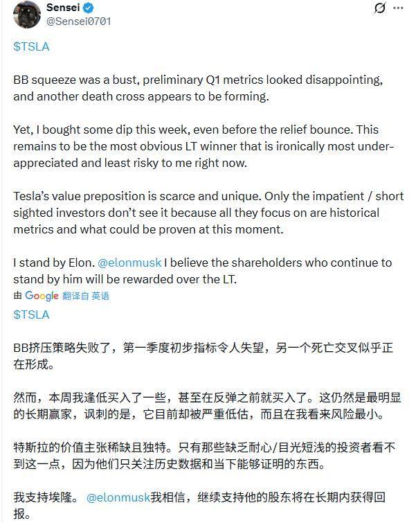 但商场中也不乏强项的抄底者。有投资者暗示,尽管第一季度盘算推算疲软且手艺面呈现下行趋势,但他还是选拔在低位增捏。该不雅点以为,特斯拉还是是最具笃信性的始终赢家,面前的震撼反而是估值建立前的买入窗口。